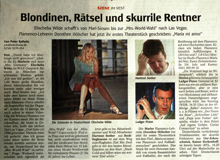 Vest. „Damit habe ich überhaupt nicht gerechnet“, jubelte die Ex-Marlerin und neue „Mrs. Germany“, Elischeba Wilde, im WAZ-Gespräch. Sie wurde in München zur schönsten Ehefrau gekürt. „Ich war tief gerührt“, so die 1,80 Meter große Blondine, deren Aktionsradius bis vor kurzem mehr oder weniger noch Marl-Sinsen war. „Ich habe aber immer noch einen Draht zur Stadt. Denn mein Ehemann Pierre arbeitet als Angestellter bei der Degussa“, erzählt die 31-Jährige, die auch schon in einem Video-Clip mit Whitney Houston vor der Kamera stand. Für die Bürokauffrau, die heute in Gescher lebt, heißt das nächste Ziel Las Vegas. „Dort habe ich 1998 geheiratet. Niemals hätte ich gedacht, dass ich genau zehn Jahre später die Reise wieder dorthin antreten werde, um Deutschland bei der „Mrs.-World-Wahl“ zu vertreten.“ Frage: Wodurch unterscheidet sich eigentlich die „Mrs.-Wahl“ von der „Miss-Wahl“? Ganz einfach: Weil eine Frau, nur weil sie geheitratet hat, nicht unattraktiver wird, rief der Großvater von Paris Hilton vor 15 Jahren einen Model-Wettbewerb für verheiratete Frauen (21 bis 42 Jahre) ins Leben.