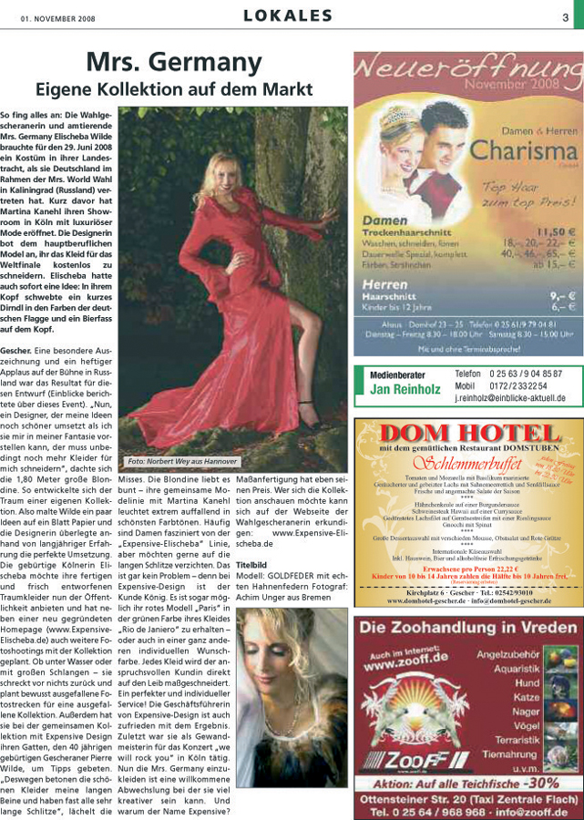 „Deswegen betonen die Kleider meine langen Beine ..“lächelt die Misses. Die Blondine liebt es bunt- ihre gemeinsame Modelinie mit Martina Kanehl leuchtet extrem auffallend in den schönsten Farbtönen. Häufig sind die Damen fasziniert von der Linie, aber möchten gerne auf die Schlitze verzichten. Das ist gar kein Problem alles ist Maßarbeit und der Kunde ist König. Jedes Kleid wird der anspruchsvollen Kundin direkt auf den Leib maßgeschneidert. Ein perfekter und individueller Service! Die Geschäftsführerin ist auch zufrieden mit dem Ergebnis. Zuletzt war sie als Gewandmeisterin für das Musical „we will rock you“ tätig. Nun die Mrs. Germany einzukleiden, ist eine willkommene Abwechslung bei der sie viel kreativer sein kann.(..)