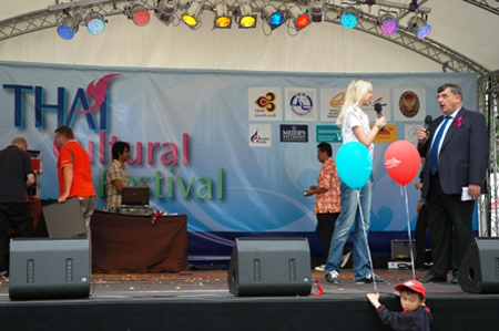 Das Thai Culture Festival war ein voller Erfolg! Fast die ganze Zeit hatten wir Sonne pur und auf der Bühne wurden stimmungsvolle Shows mit traumhaften Kostümen und mitreißender Musik geboten. Die Ausstellerstände boten eine Küche wie man sie aus Thailand kennt: Authentisch, aromatisch und richtig lecker! Ich liebe Kokosmilchsaucen, Currys und die berühmte Erdnusssauce des Landes. Mehrmals täglich wurden Live Kochdemonstrationen geboten. Wenn einmal alle Zutaten schön klein geschnitten sind, dann geht das Anbraten im Wok ziemlich schnell. Ich stand mit Mikrofon daneben und habe den hervorkommenden Duft genossen.