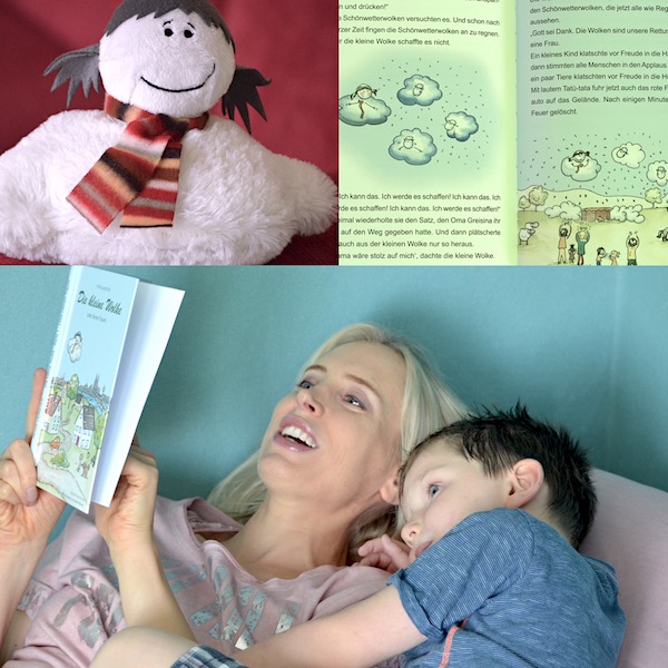 3 x das Kinderbuch „Die kleine Wolke“ von der Autorin Petra Lahnstein zusammen mit einer kuscheligen Wolke zum Schmusen.