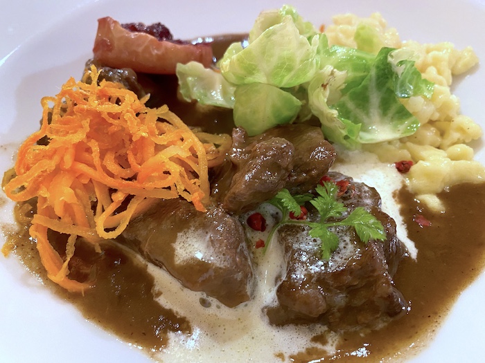 Wir unterhalten uns außerdem darüber, dass das Fleisch von Tieren stammt, die reichlich Auslauf haben. Pierre schmecken die raffinierten Wildgerichte am Abend besonders gut.